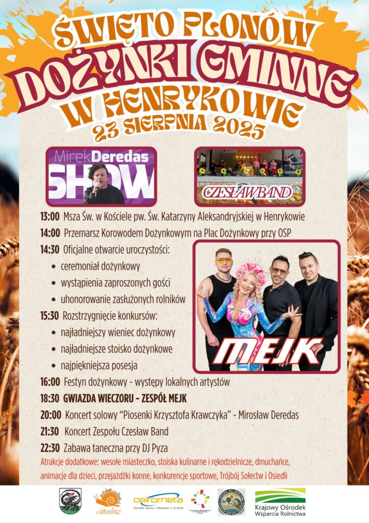 Święto plonów w gminie Henrykowo – gwiazdą wieczoru będzie zespół Mejk, a wcześniej koncert Czesław Band i Mirek Deredas Show.