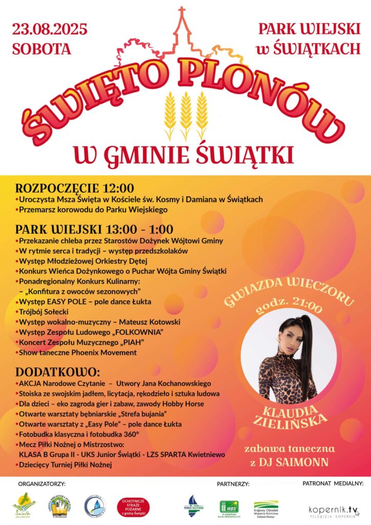 Święto Plonów w Parku Wiejskim w Świątkach – gwiazdą wieczoru będzie Klaudia Zielińska. Liczne konkursy, występy folkowe i atrakcje dla dzieci.